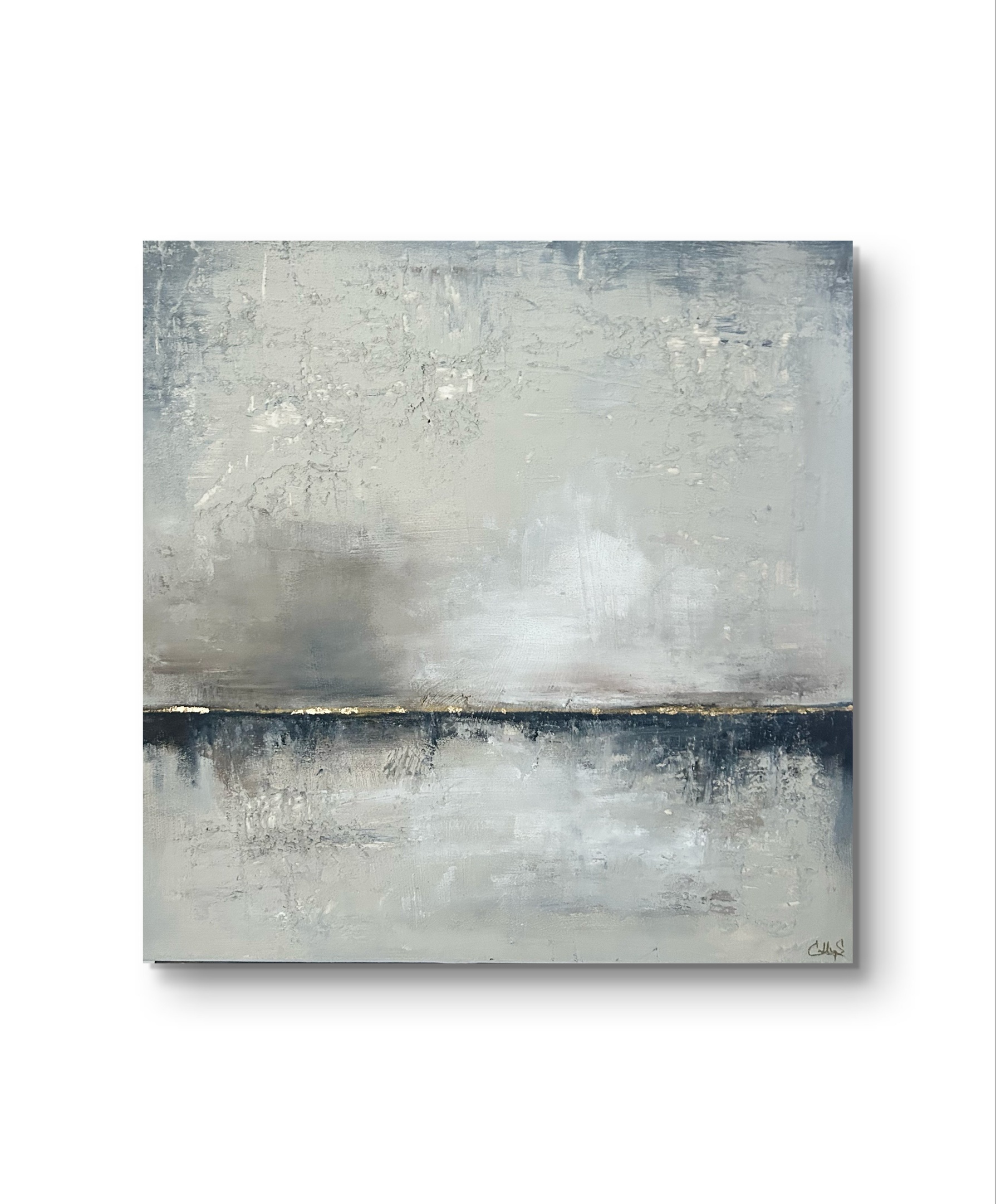 Silent Tides skildrar mötet mellan stilla vatten och en dämpad horisont, där gråblå toner och mjuka skiftningar skapar en känsla av lugn och efterklang. Den tunna linjen av bladguld markerar gränsen mellan hav och himmel – en subtil rörelse i ett annars tyst landskap. Målningen bär på ett lågmält djup och förmedlar känslan av ebb och flod i sin mest stillsamma form.