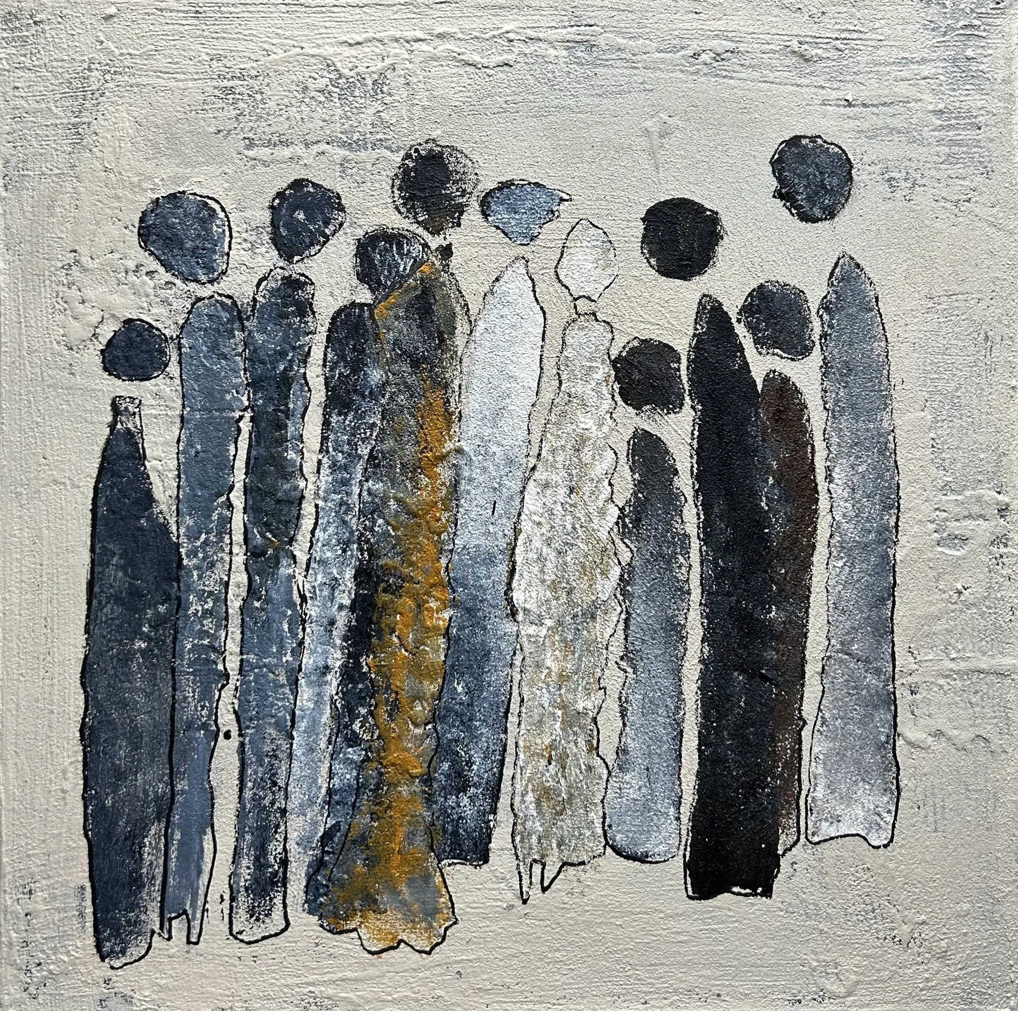 Shadow Collection består av unika originalverk där struktur och kontrast är grunden. Varje målning byggs upp lager på lager med spackel, cement och andra texturmaterial och färgpaletten är avskalad och hålls inom svart, offwhite och jordnära toner. I mötet mellan ljus och mörker framträder mänskliga och abstrakta former – det synliga och det som bara anas.